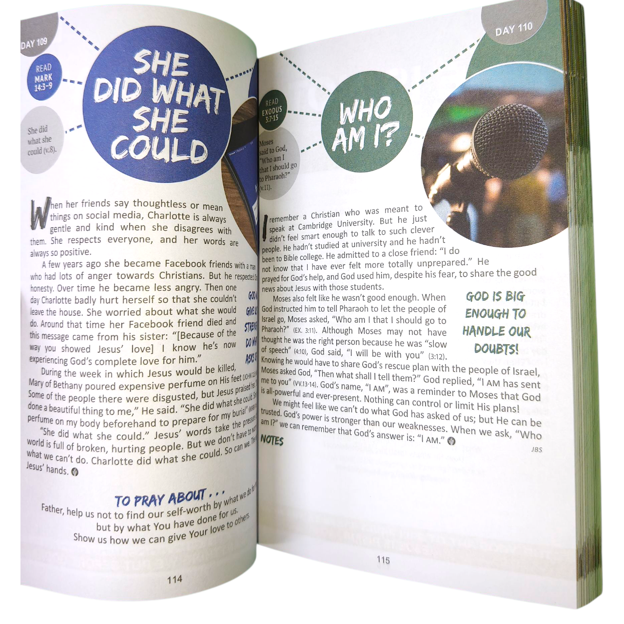 Short, reflective questions and thought starters throughout the planner to help teens think about their worth and purpose in God. -