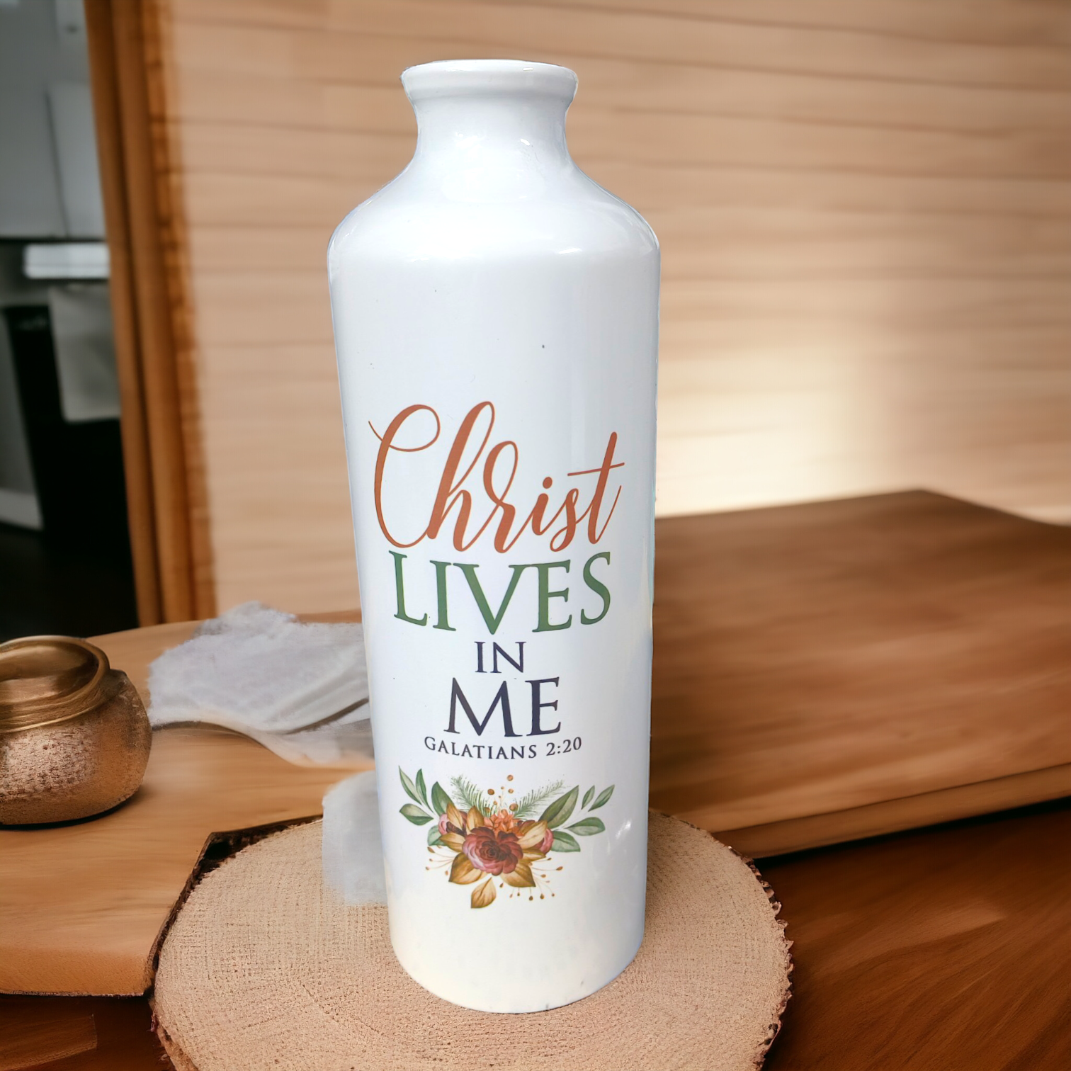 The bottle is printed with the uplifting Bible verse Galatians 2:20, which serves as a constant reminder of the transformative power of faith in Christ and the new life we have through Him. The white blank background provides a clean and stylish look, making it an attractive accessory for any setting.