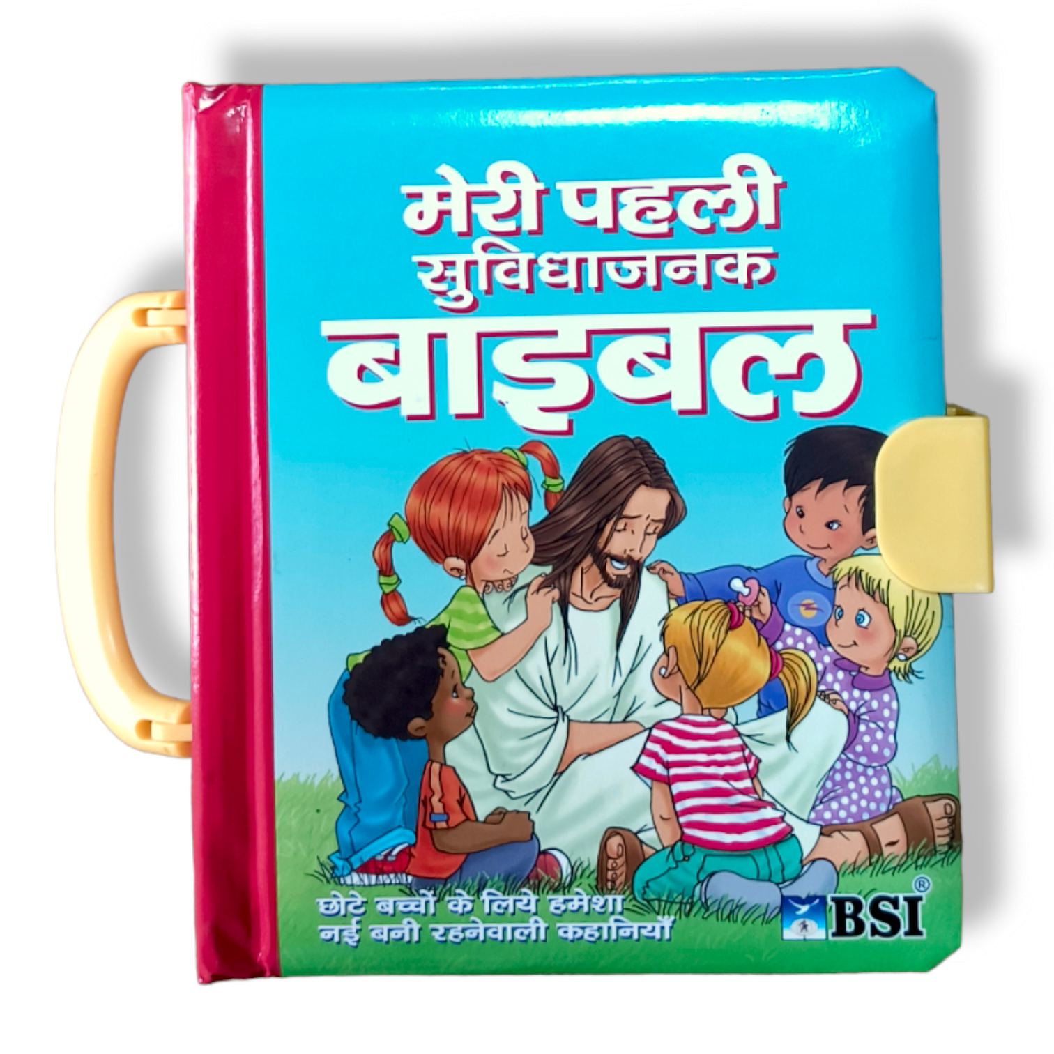 The Bible text is often presented in a clear, age-appropriate language with a font size suitable for young readers. The text is designed to be engaging and understandable for children. These Bibles are constructed to withstand the wear and tear that may come with regular use by children. They often have a sturdy cover, reinforced binding, and pages that can withstand some rough handling.The key feature of this Bible is the built-in handle, which makes it easy for children to carry and transport the Bible themselves. The handle is typically integrated into the Bible's cover or binding.Children's Carry-Along Bibles often include colorful and age-appropriate illustrations, maps, and images to enhance understanding and engagement with the biblical stories. These Bibles may focus on key stories and narratives from the Bible, making it easier for children to navigate and read. : Some editions may include age-appropriate devotionals, prayers, or explanations to help children understand the message of the Bible and its relevance to their lives. God Blessing Words Bible Easy To Read In This Hindi Bible.