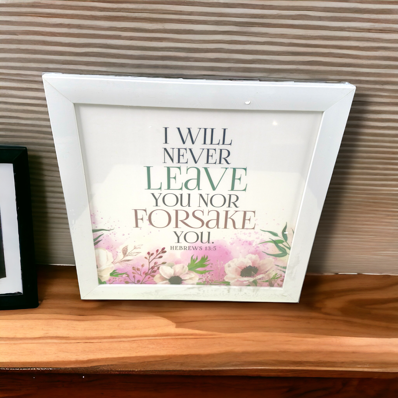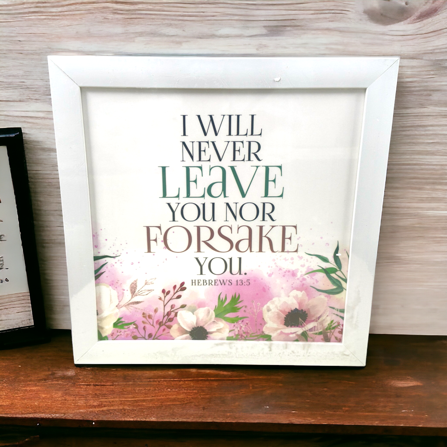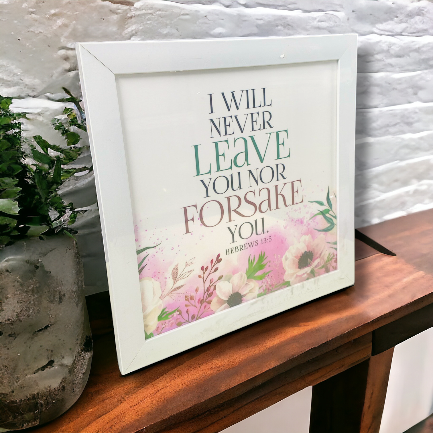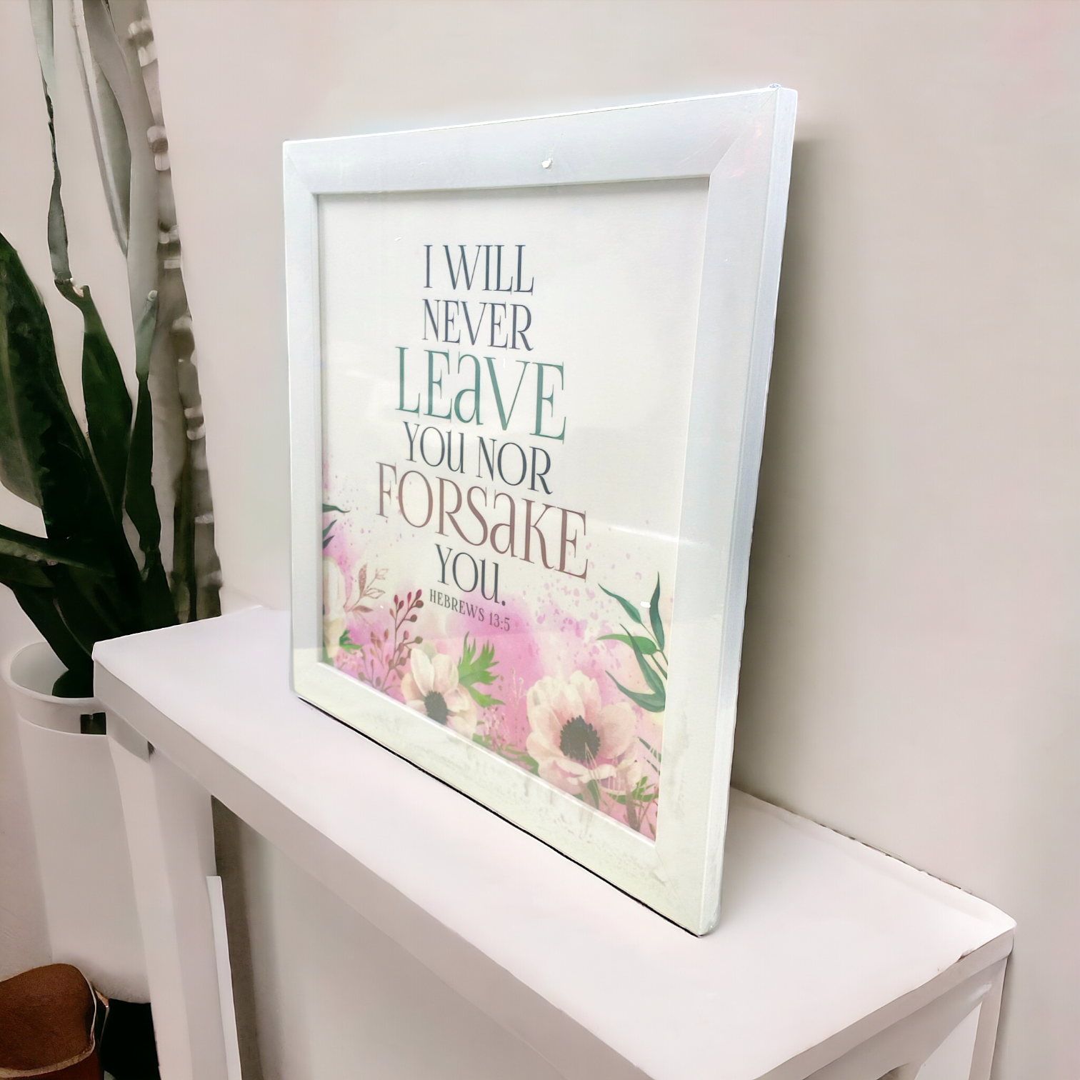 Bring peace and reassurance into your home with this Premium Bible Verses Photo Frame, beautifully showcasing the comforting scripture from Hebrews 13:5: