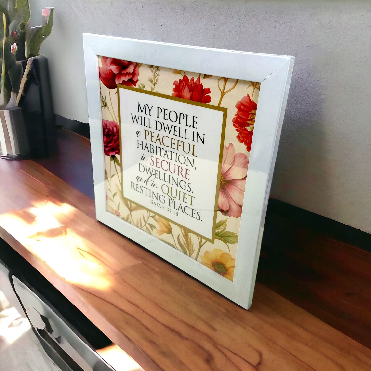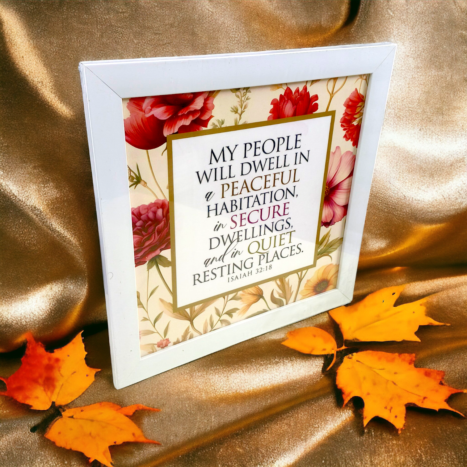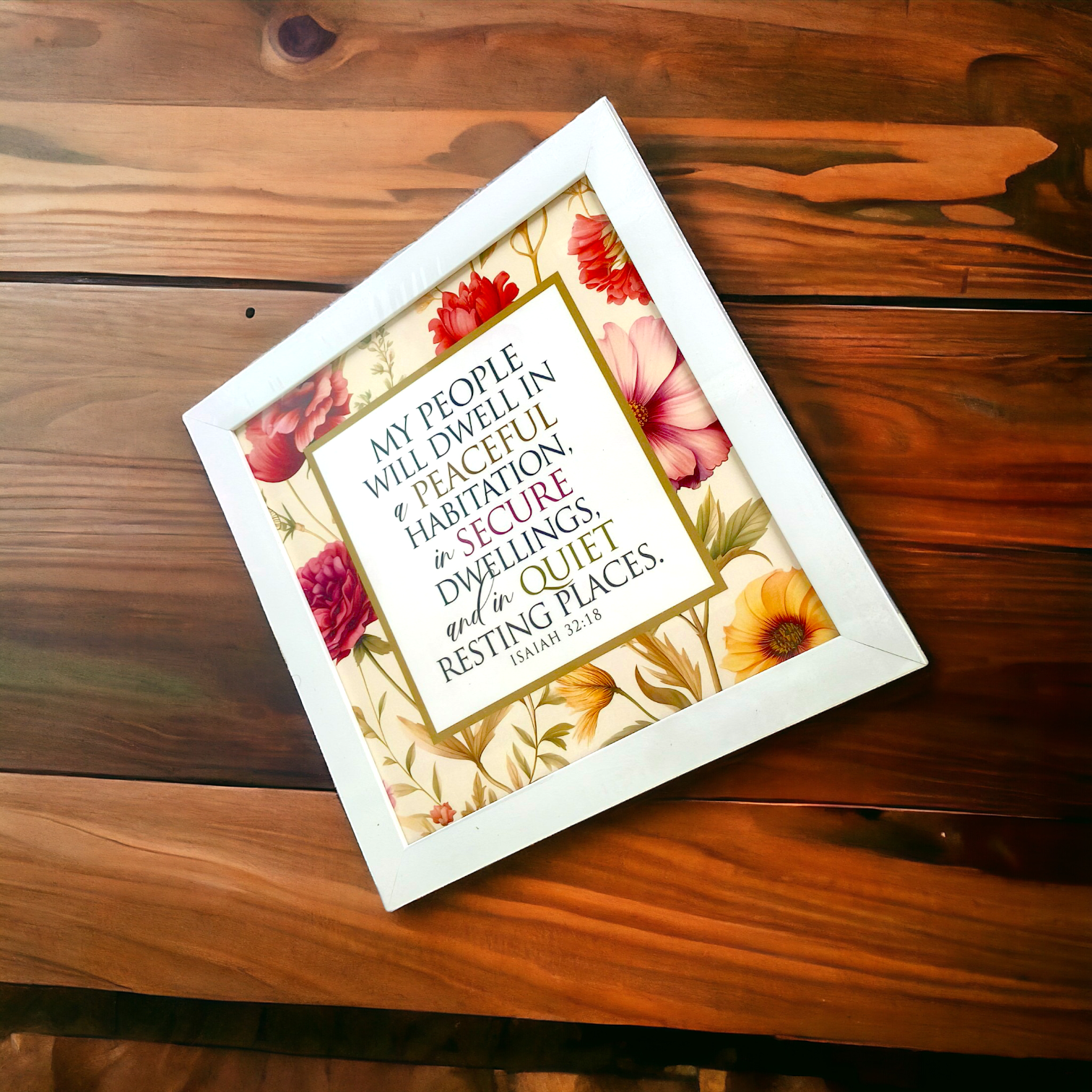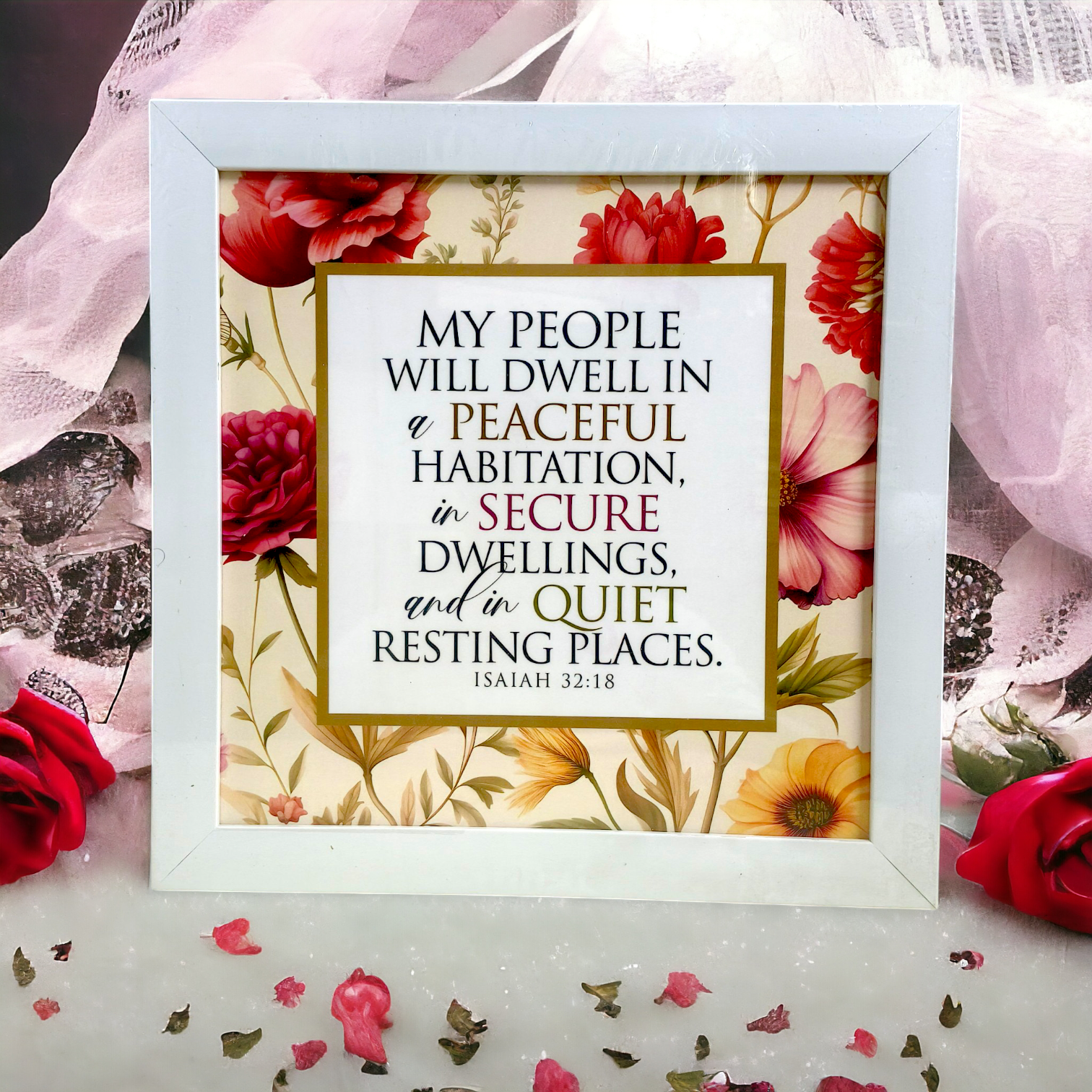 Bring peace and security into your home with this Premium Bible Verses Photo Frame, beautifully displaying the reassuring scripture from Isaiah 32:18: