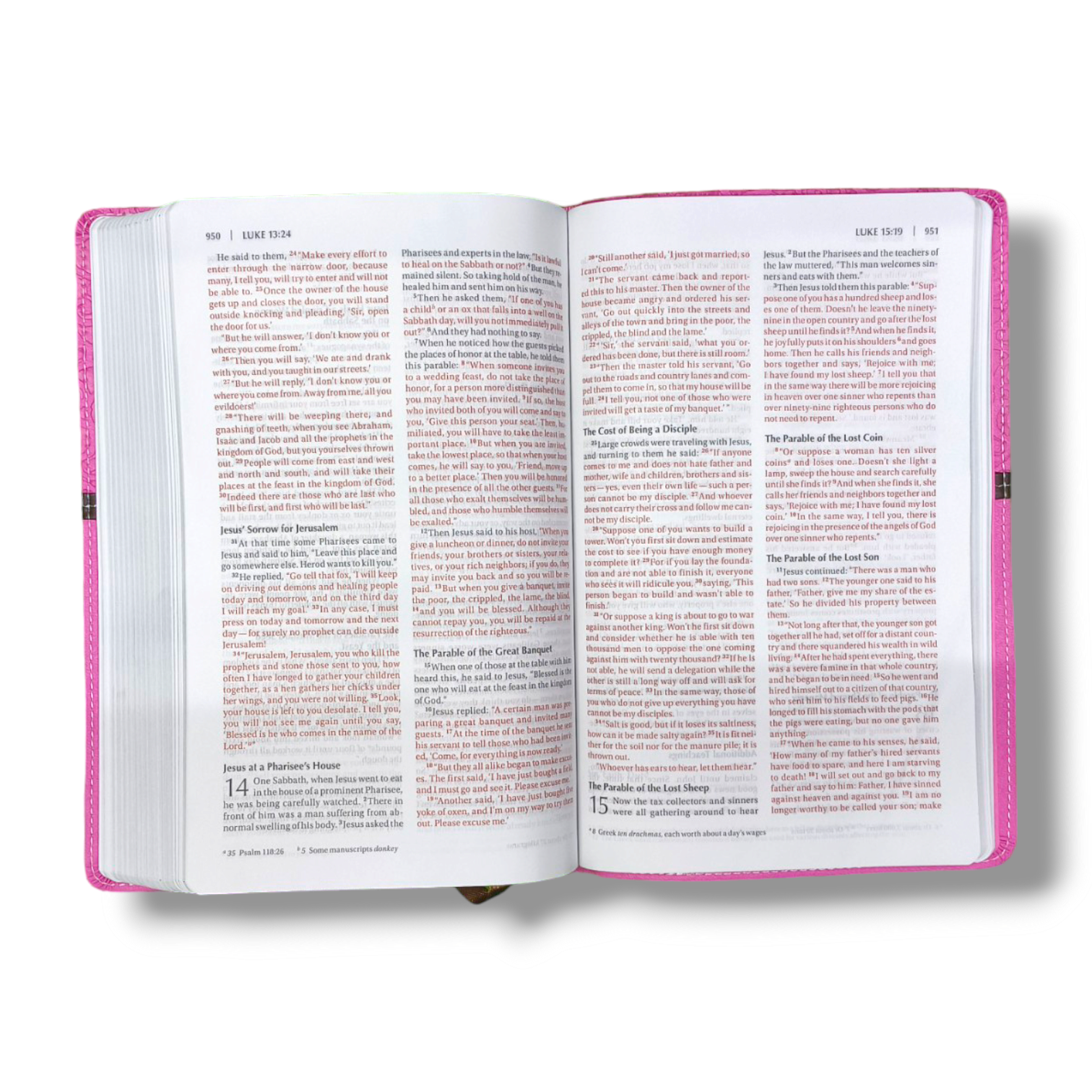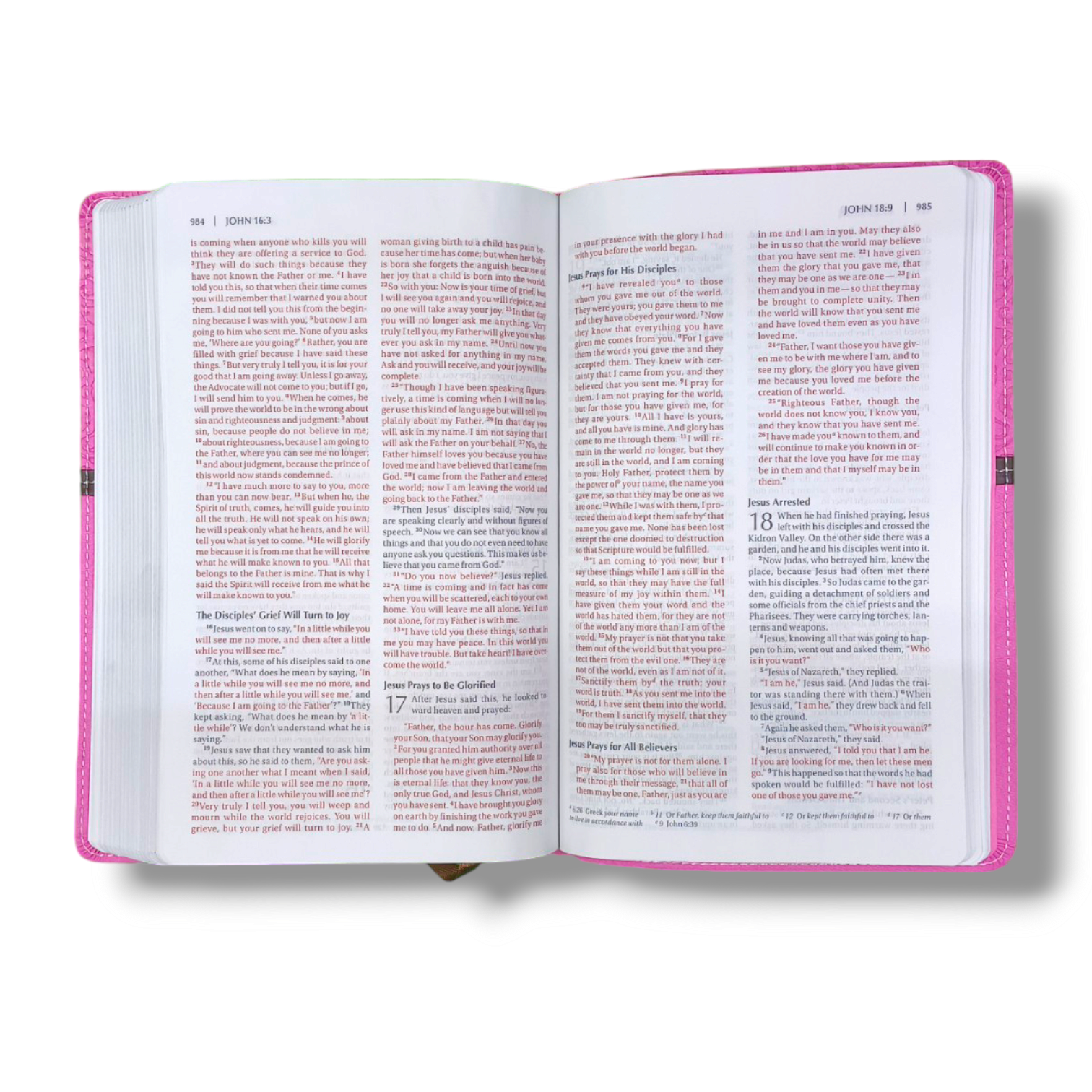 Italian Duo-Tone Cover: Adorned with a luxurious Pink and Plum Italian Duo-Tone cover, this Bible exudes elegance and style, making it a delightful addition to your collection.