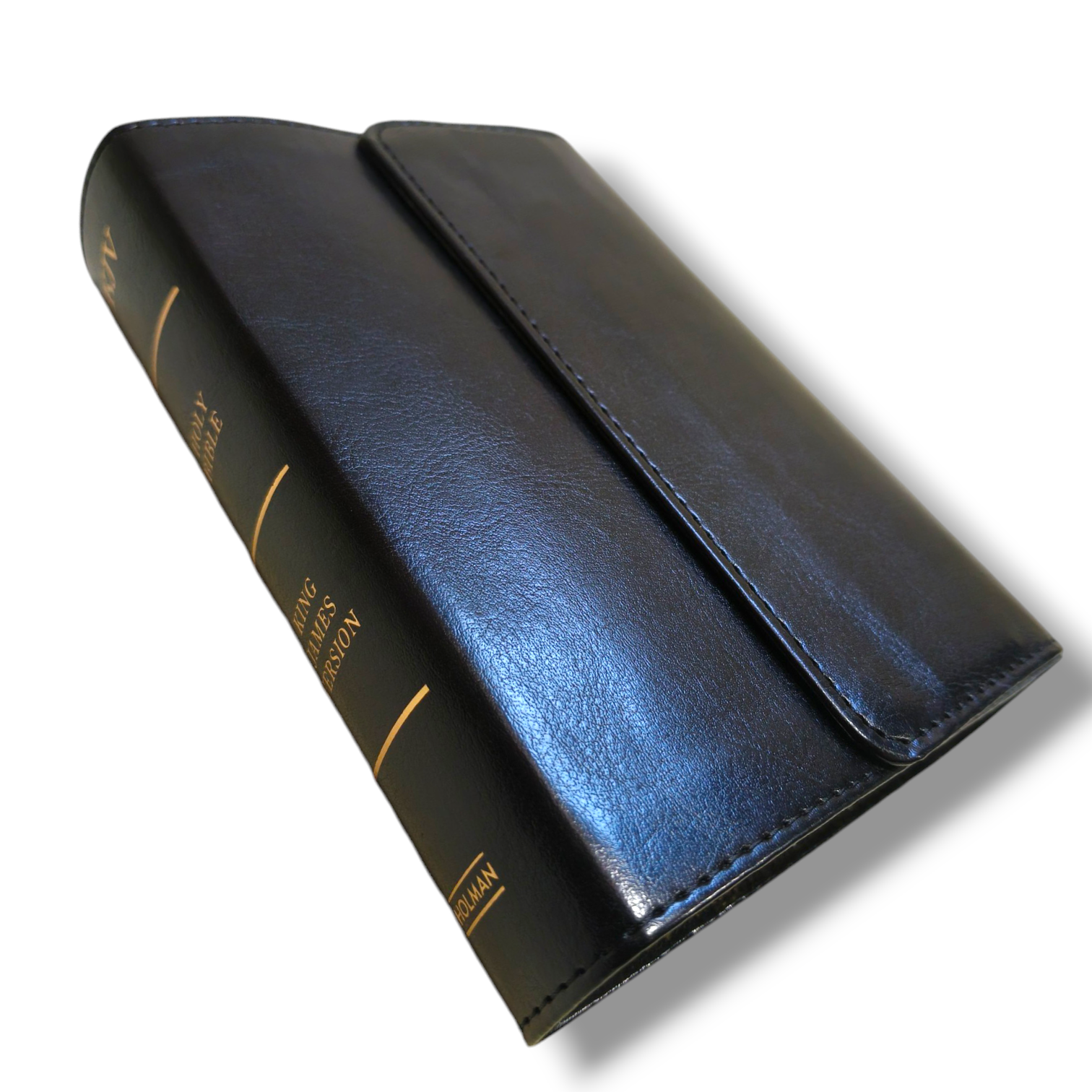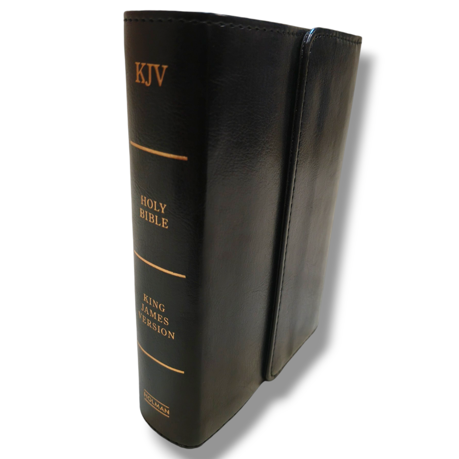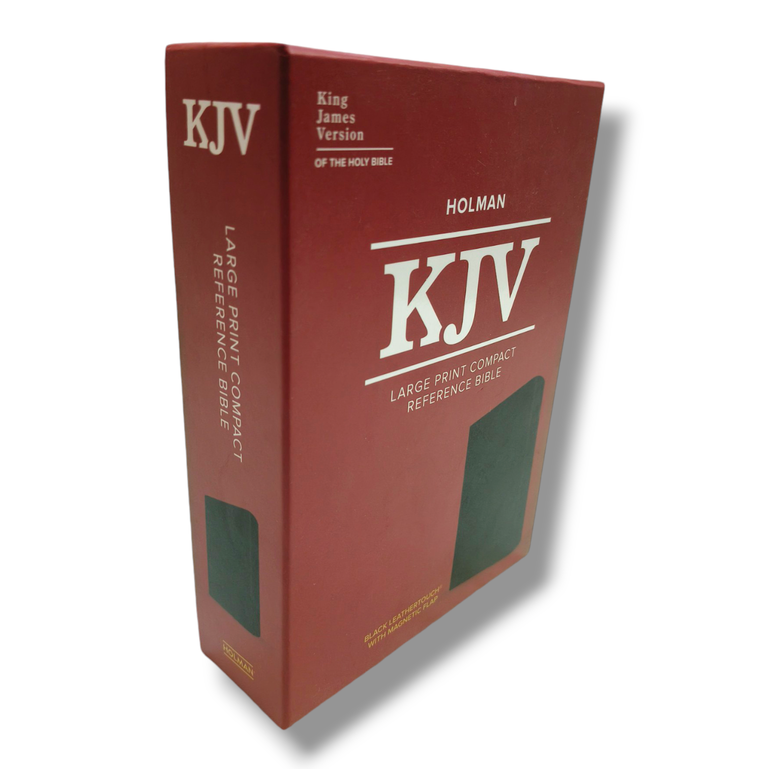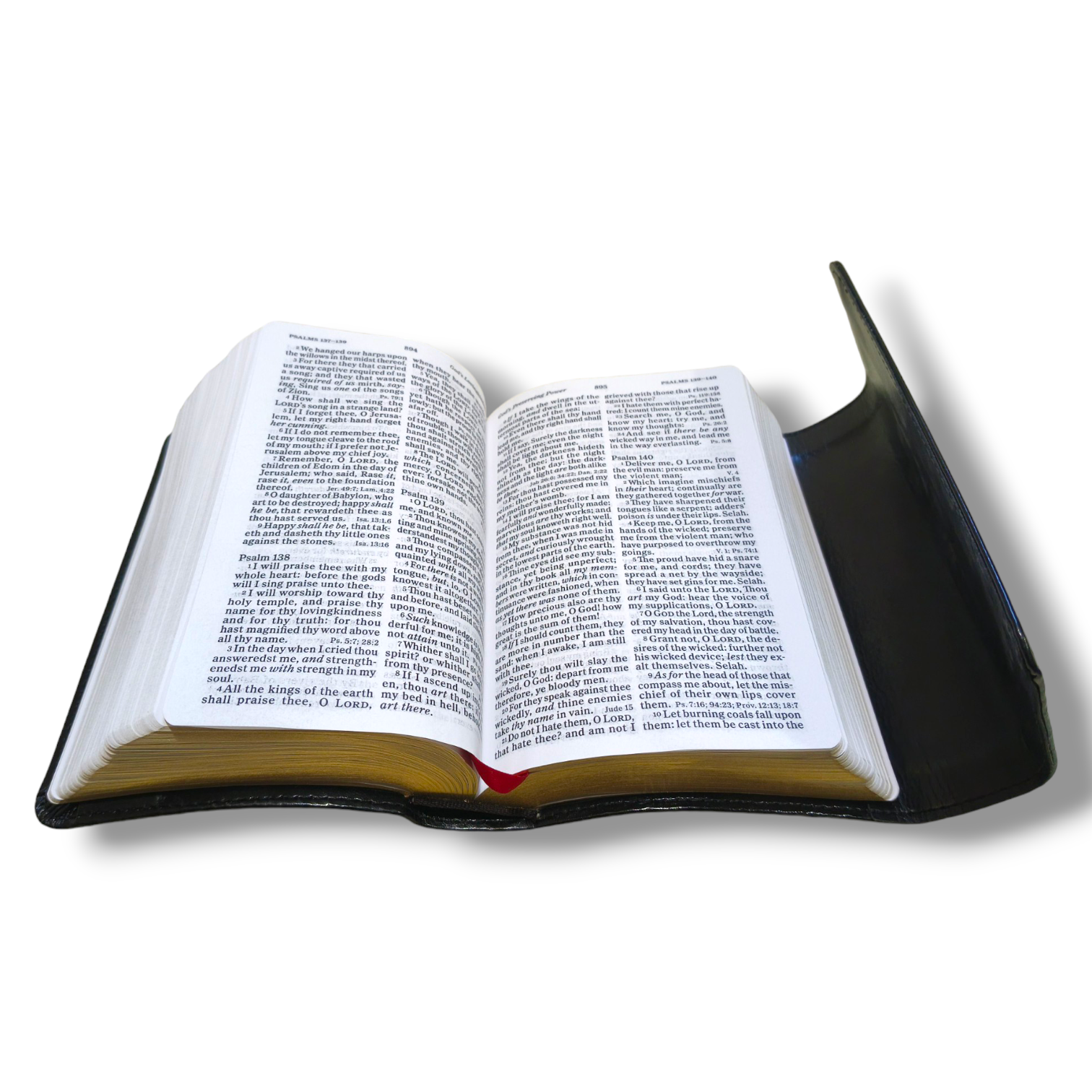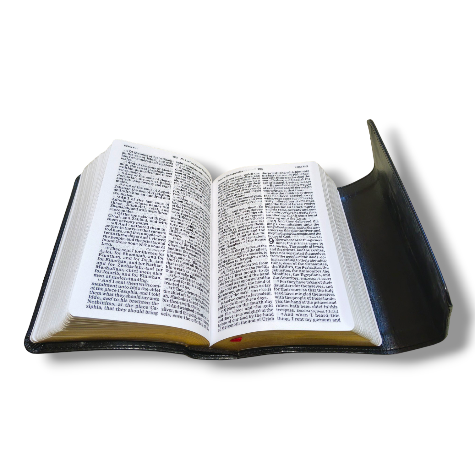 Description: This KJV Reference Bible combines classic elegance with practical features, crafted for those who prefer a larger print and easy-to-read format. Bound in premium black leather with a protective flap cover, this edition is both durable and sophisticated. Golden-edged pages add a refined touch, while the red-letter text highlights the words of Christ, enhancing readability and study. The new edition includes updated references and notes for deeper scriptural understanding, making it ideal for both personal devotion and in-depth study.