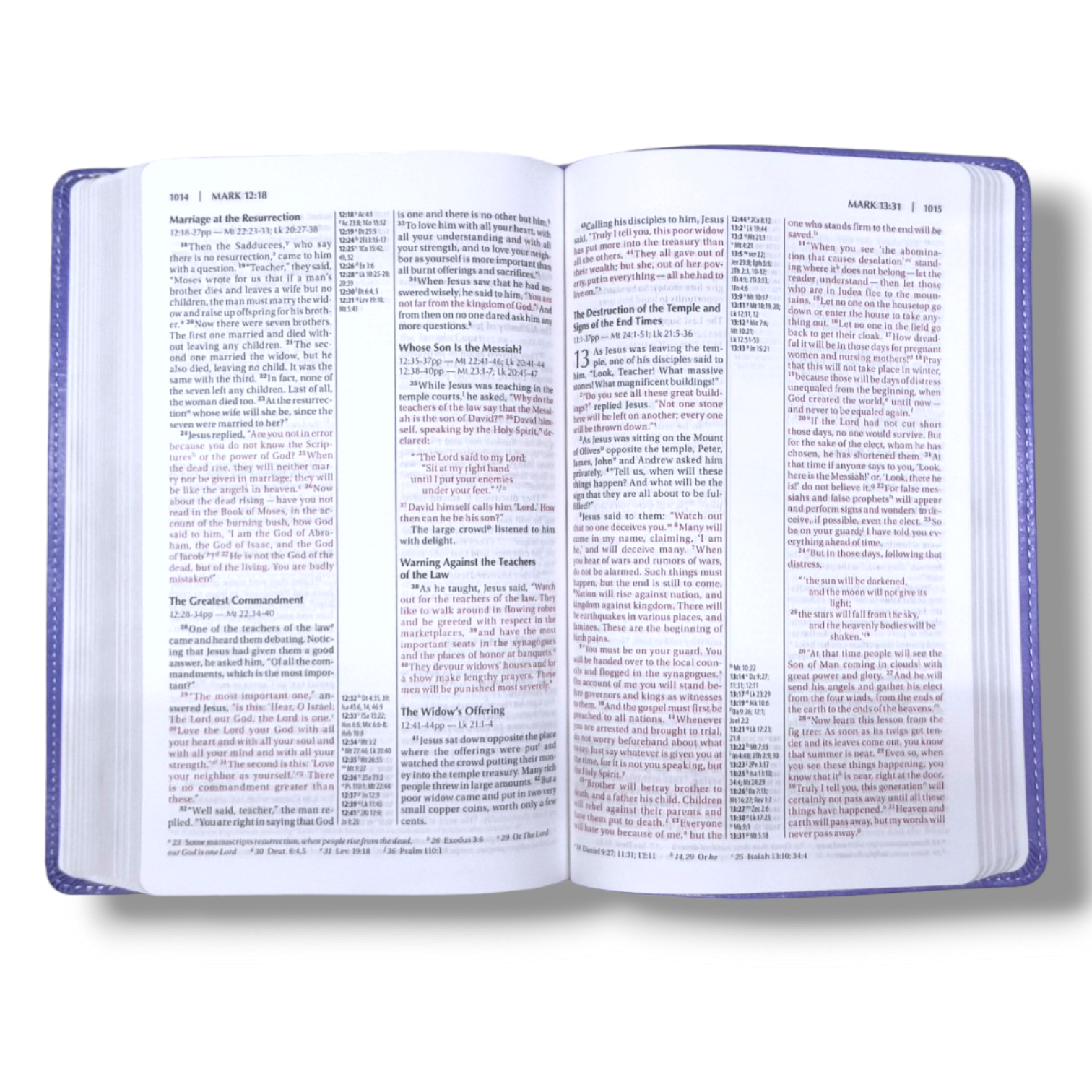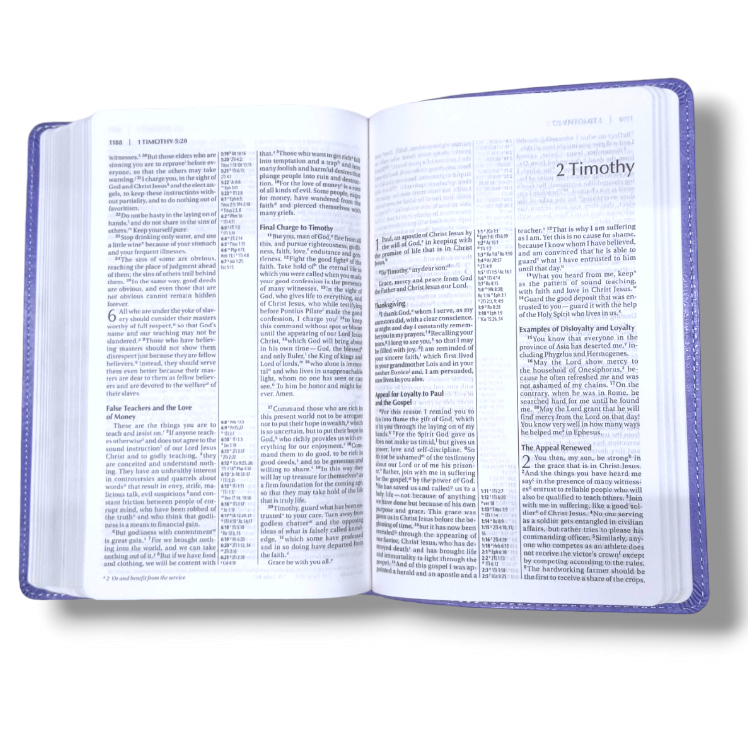 Lavender Italian Duo-Tone: The Bible is luxuriously presented in an attractive purple design bound cover with Lavender Italian Duo-Tone, combining style with durability for a lavish and enduring appearance.