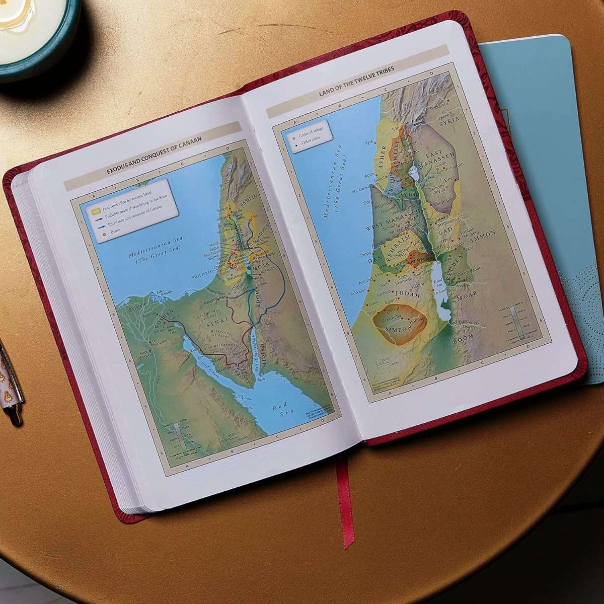 - Full color maps show a visual representation of Israel and other biblical locations for better context
