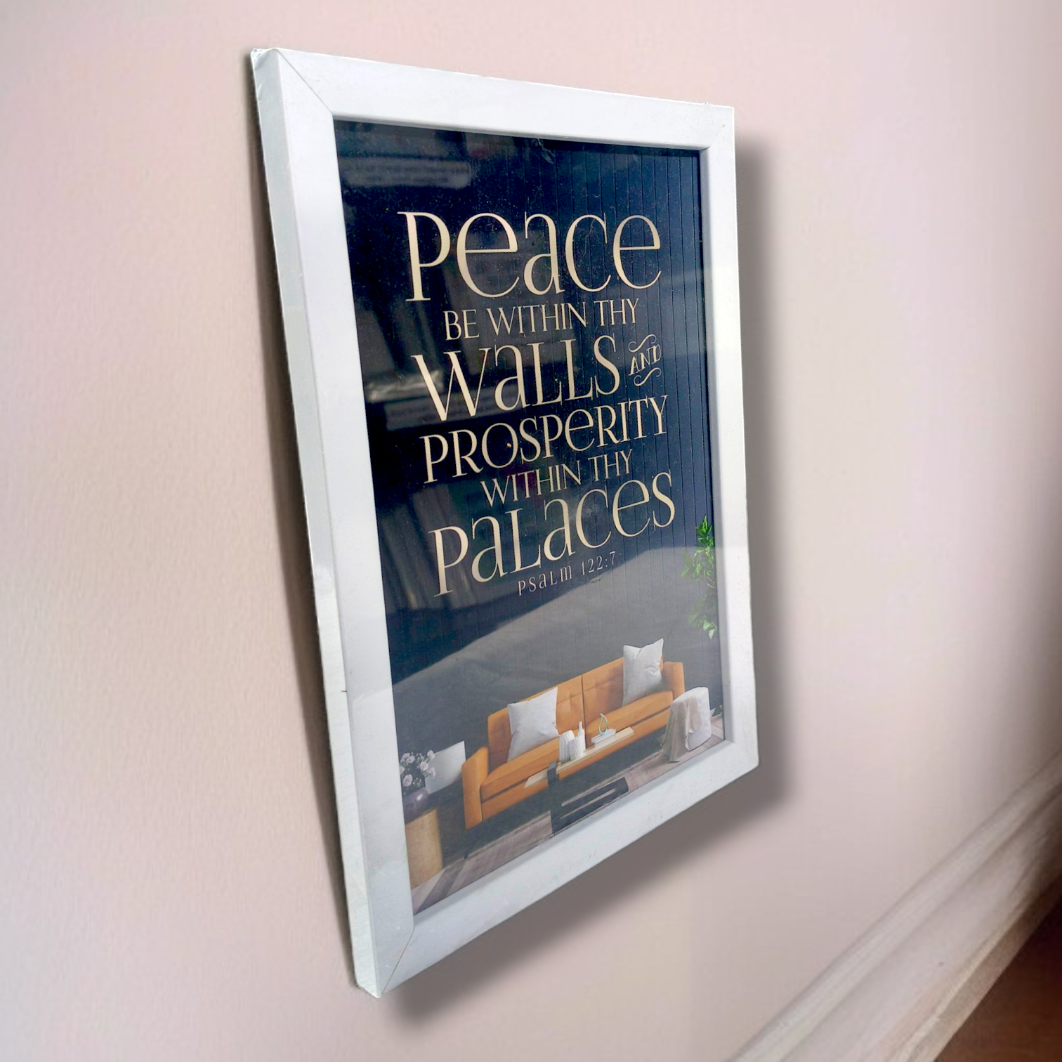What distinguishes this frame is the inclusion of the heartfelt and hopeful verse from Psalm 122:7: "Peace be within your walls and prosperity within your palaces." This timeless scripture offers a powerful message of well-wishes and blessings for the home and all who dwell within it. Displaying this verse serves as a daily affirmation of these desires, fostering an atmosphere of tranquility and abundance in your living space.