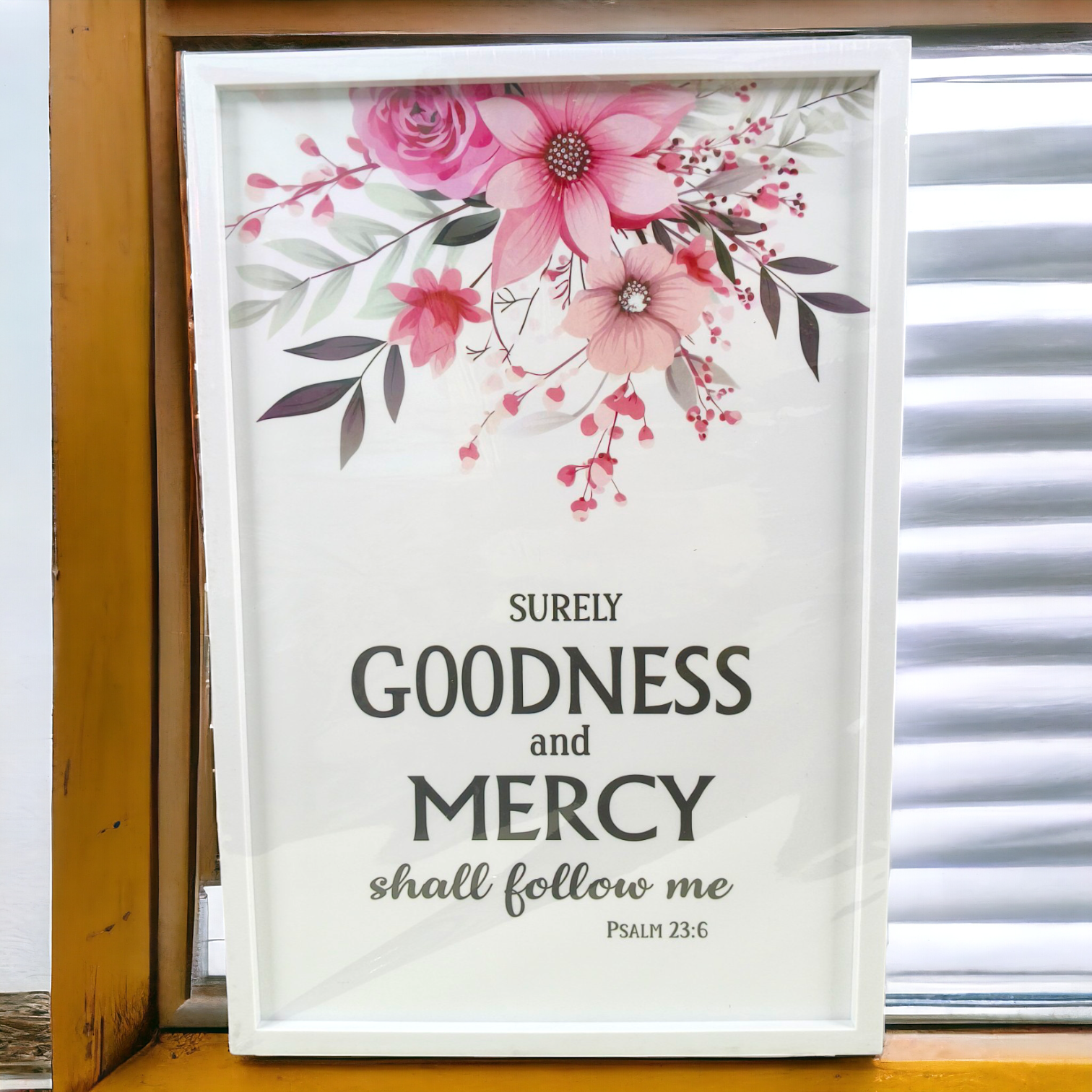 Scripture: Displays the Bible verse Psalms 23:6 from the NKJV (New King James Version): "Surely goodness and mercy shall follow me All the days of my life; And I will dwell in the house of the Lord Forever."