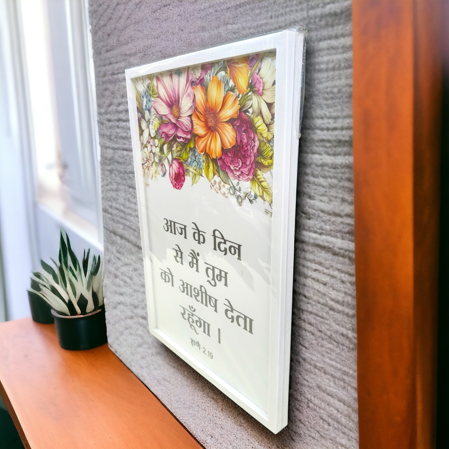The Premium Hindi Bible Verses Photo Frame you're describing sounds like a beautiful and meaningful piece of home decor. Featuring a Bible verse in Hindi, such as हाग्गै 2:19 (Haggai 2:19), it can serve as a daily reminder of faith and inspiration. Here’s a breakdown of its features: