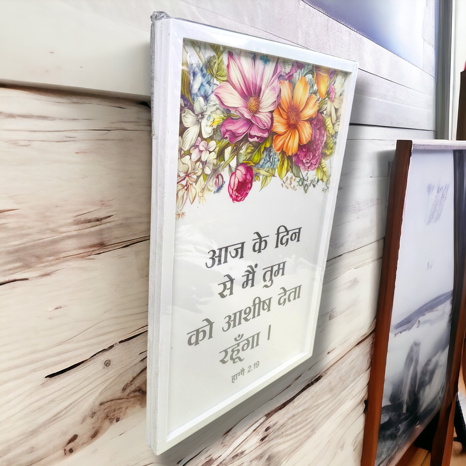 Verse: The frame showcases a meaningful Bible verse in Hindi, such as हाग्गै 2:19, which translates to: