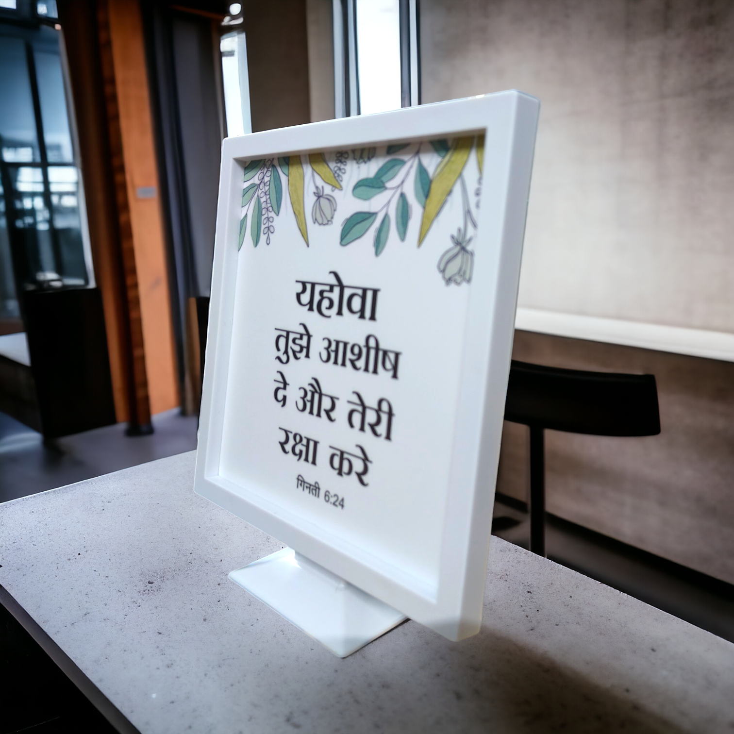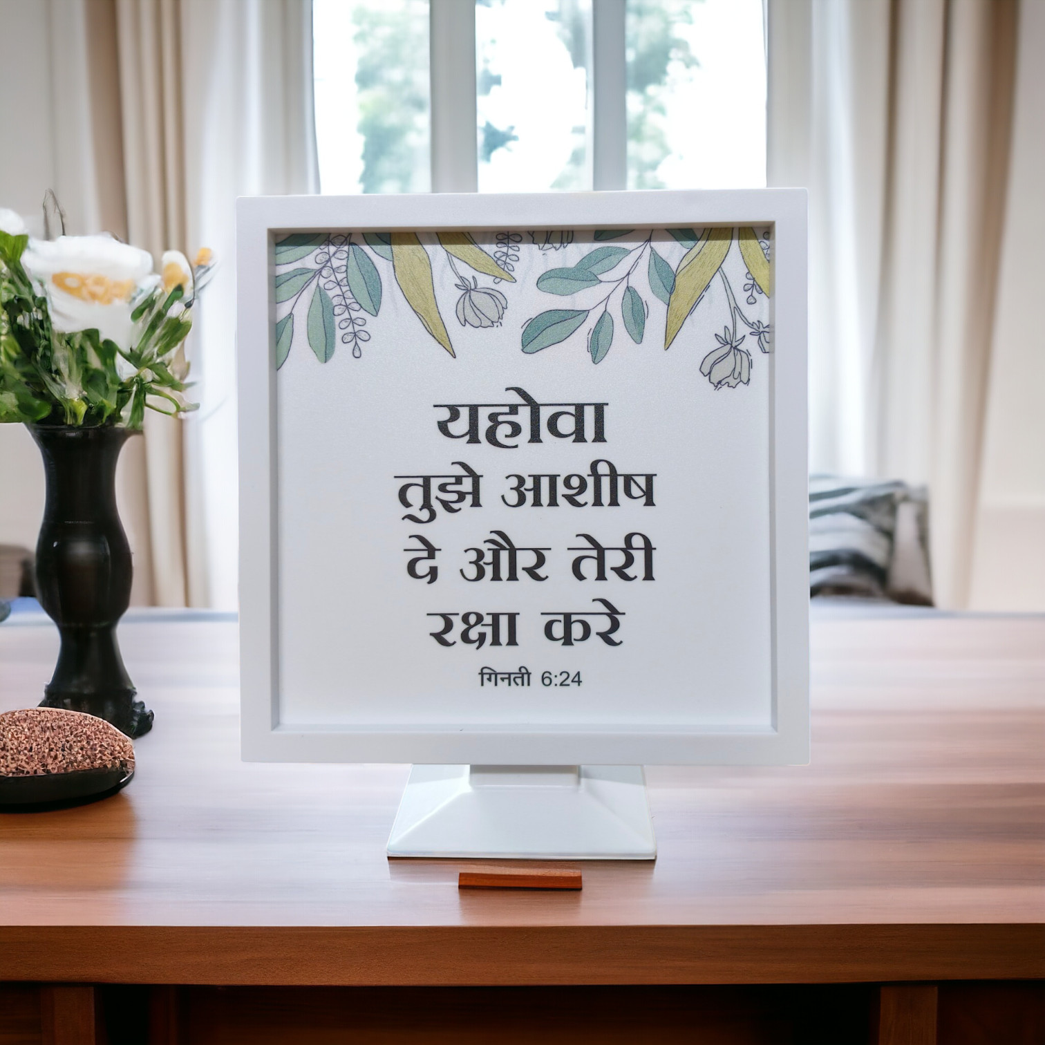Enhance your home with this High-Quality Stand Frame, featuring the Bible verse Numbers 6:24 (गिनती 6:24): "The Lord bless you and keep you." This elegant and durable frame is perfect for placing on a desk, shelf, prayer corner, or office table, offering daily inspiration and spiritual encouragement. Crafted with premium materials, it adds a divine touch to any space while serving as a meaningful gift for loved ones on special occasions. A timeless decor piece that blends faith, beauty, and blessings in one elegant design
