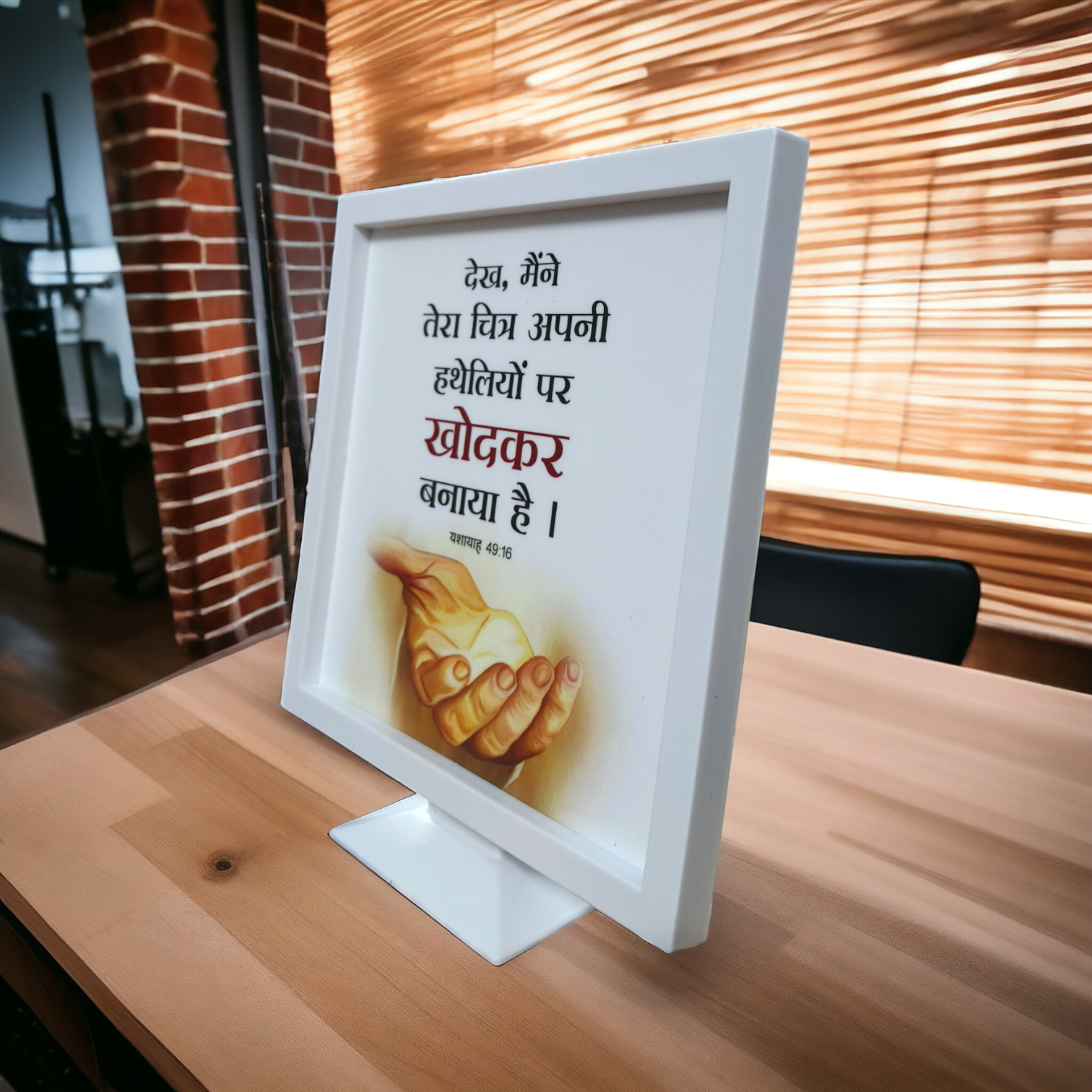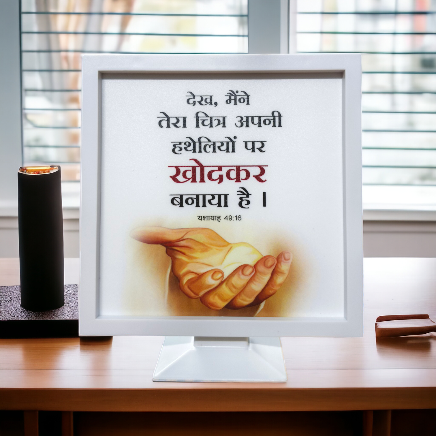 Bring a touch of faith and inspiration to your home with this High-Quality Stand Frame featuring the powerful verse Isaiah 49:16 (यशायाह 49:16): "See, I have engraved you on the palms of my hands." This beautifully designed frame is perfect for placing on desks, prayer tables, or shelves, serving as a daily reminder of God's love and care. With its premium craftsmanship and elegant finish, it makes an ideal gift for loved ones on special occasions. Elevate your home decor with this timeless piece that combines faith, beauty, and inspiration in one elegant design.