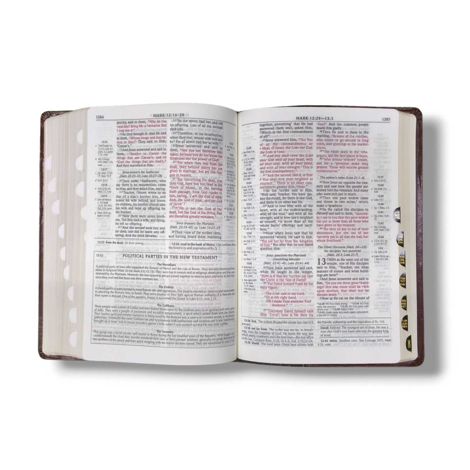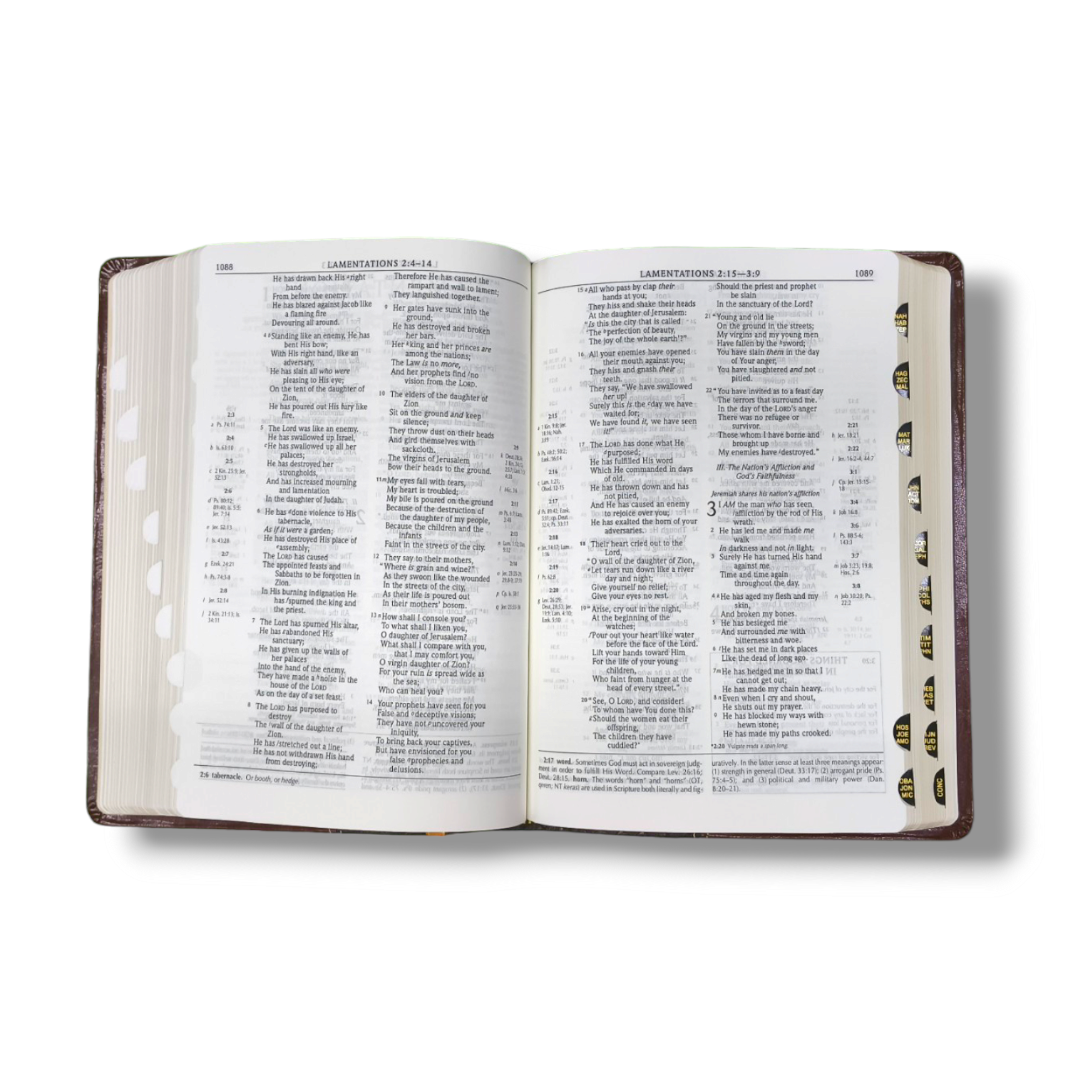 Thumb Indexed: Easily navigate through the Bible with thumb indexing, allowing you to quickly find specific books and passages for efficient study and reference.